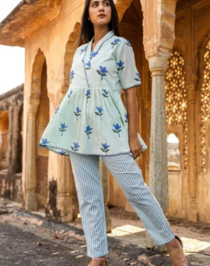 Bring you’re A-game to the party by showing up in this simple but blue color block print peplum top with cotton comfy pant. This close necked top adds some flair with moti work on top. Top Stitched with liner to give you perfect fit. The Pant fitting is so comfy